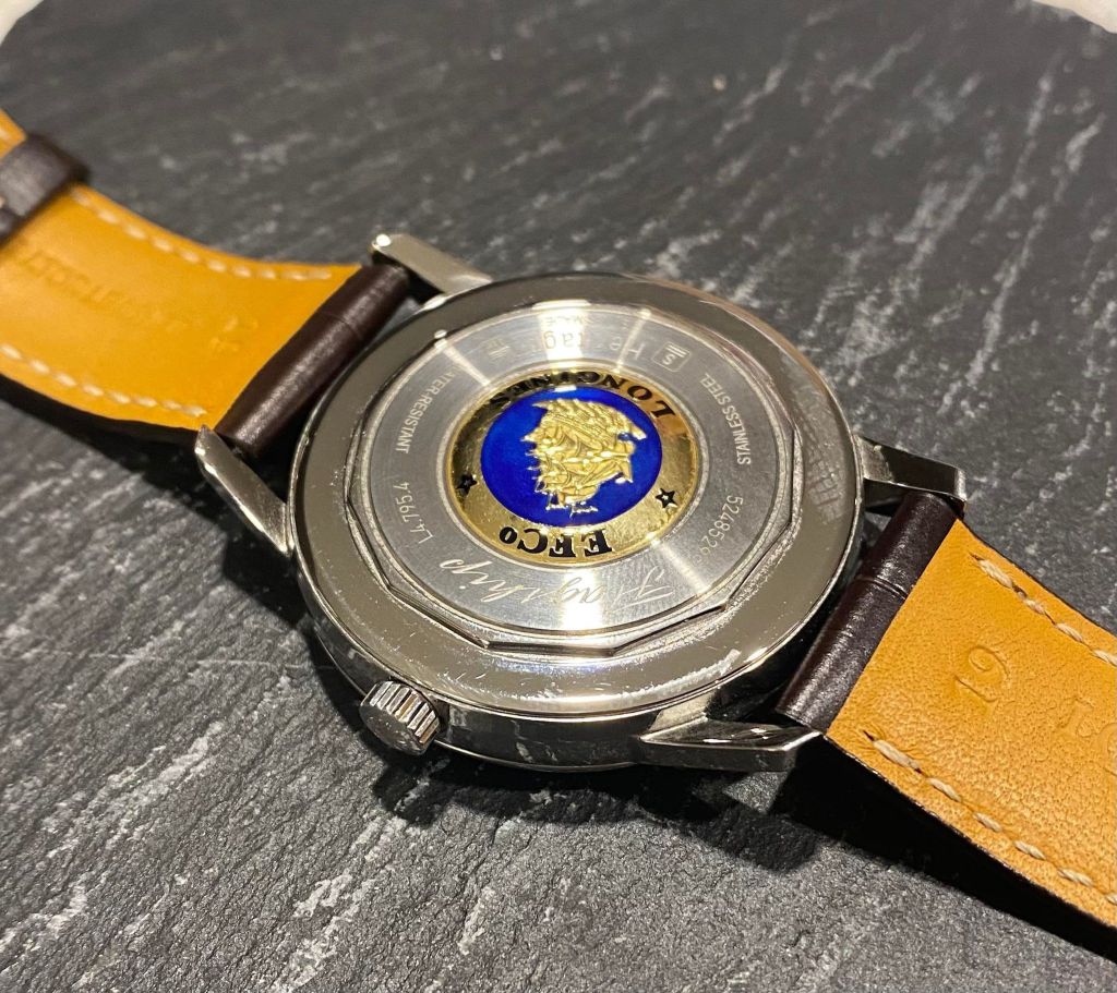 The brand Longines has a very rich history, dating back to 1832, and was a pioneer of many technologies and style aesthetics present in modern watchmaking today. Thus, not only did this particular watch boast amazing specs, but it had the heritage to back it up. Pictures do not do it justice, the cream coloured dial plays with the light as you rotate your wrist, and the case-back is absolutely mind-blowing. Adorned with an applied medallion showcasing a delicately intricate sea vessel, this case-back is truly one to see in the metal.