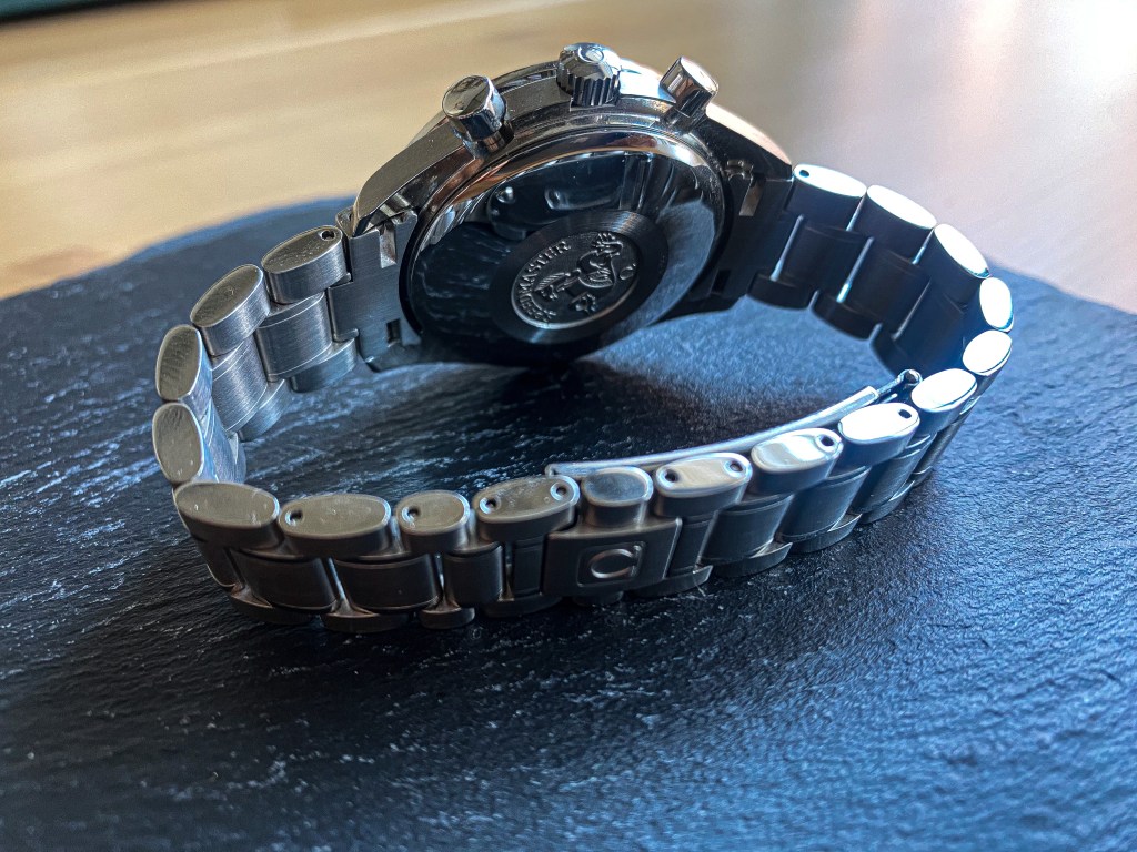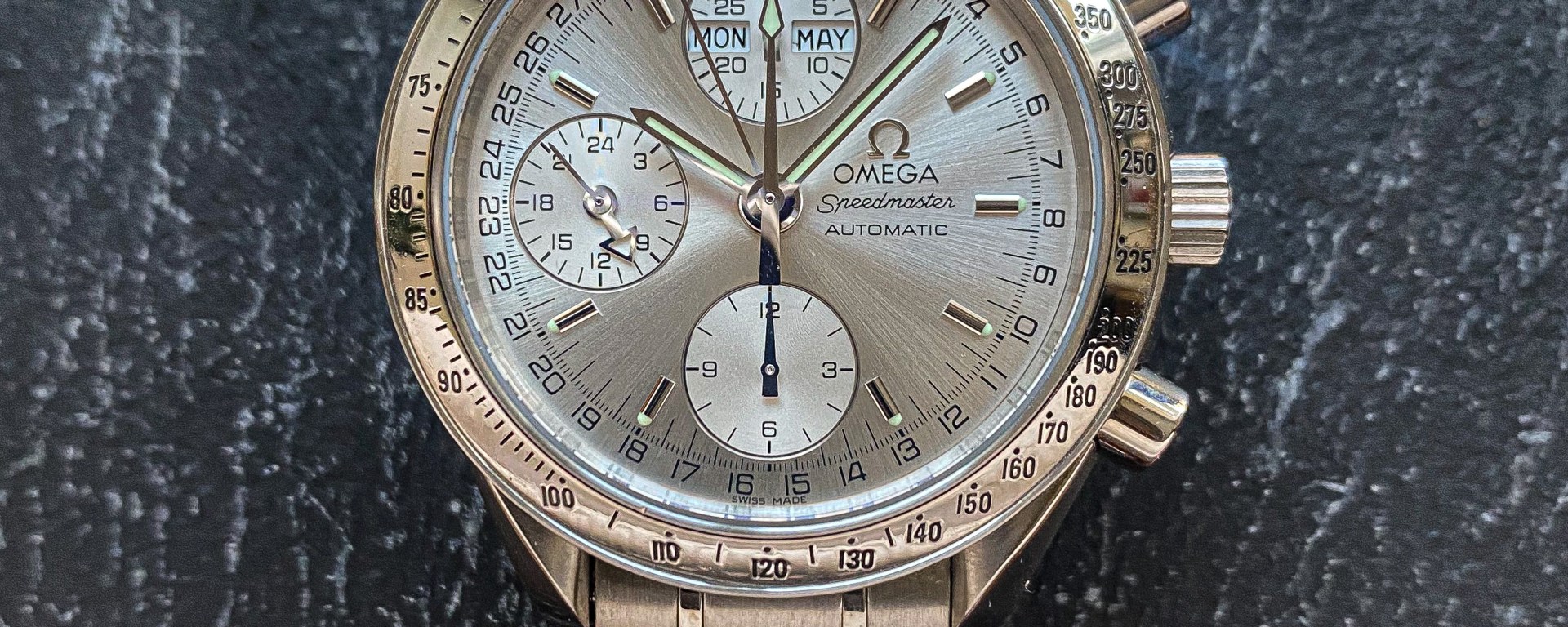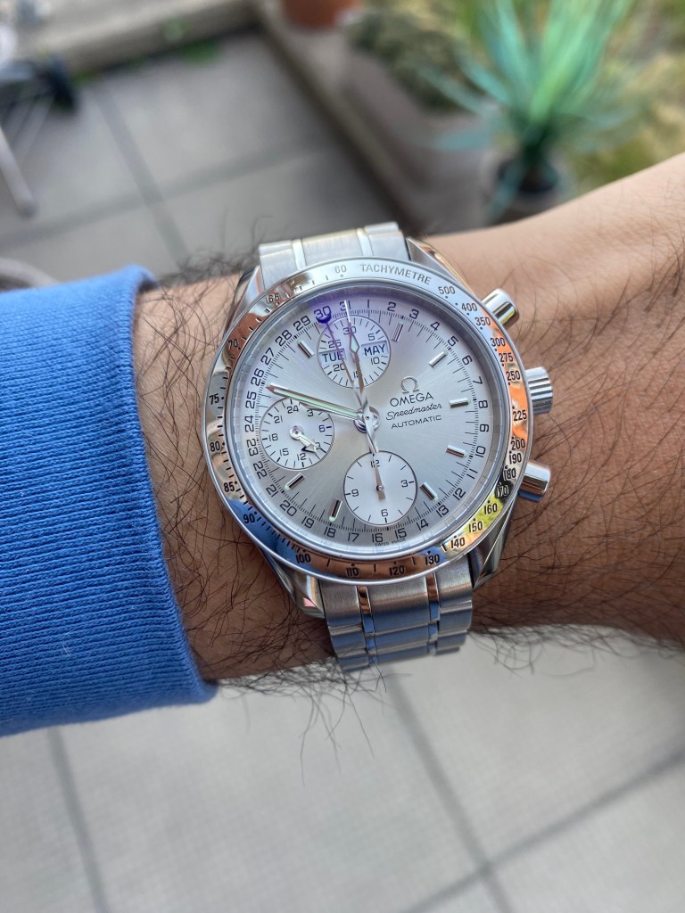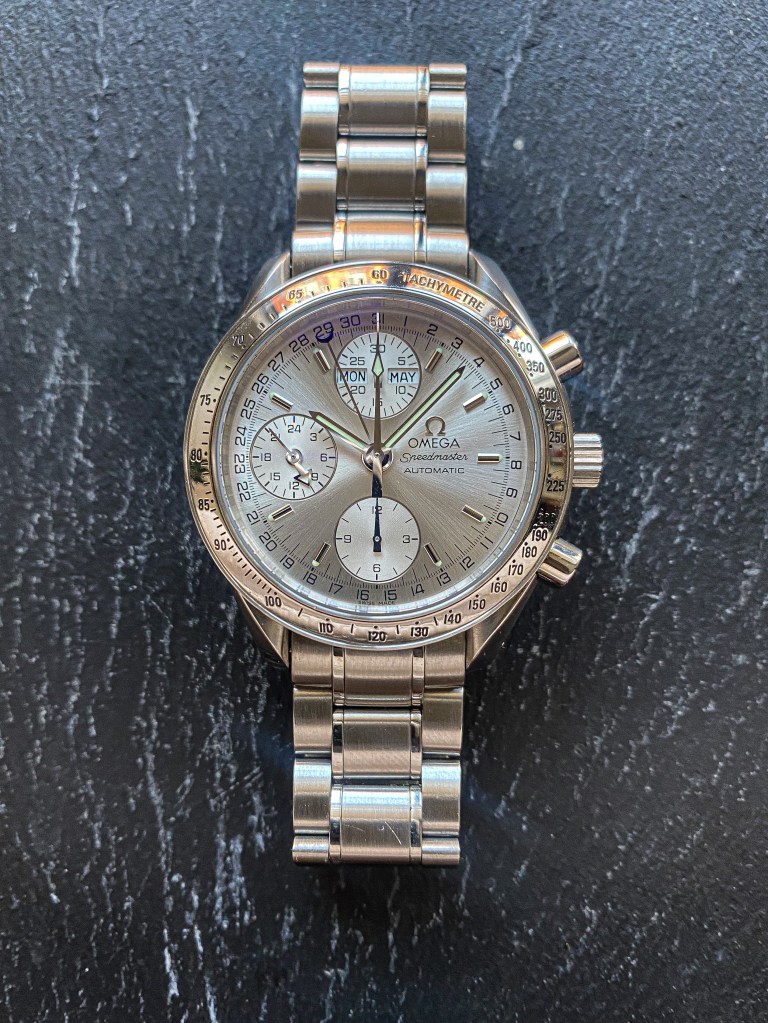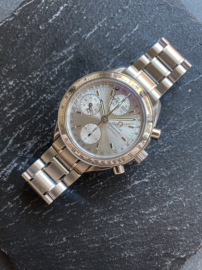 Omega, Speedmaster, Chronograph, Triple Calendar (Day/Month/Date), Silver Dial, AM/PM Indicator, 39mm, Bracelet size 18.5mm…all of the specifications dazzled in front of my eyes as I scrolled through the listing. I dragged my wife to come and take a look (she is a trained watchmaker), and she gave me the nod of approval. This was a gem, nay, a diamond in the rough. This watch would fit perfectly under my Submariner, and above my Longines in my collection. I had found it! And the price was at the low end of my budget! After trading a few more detailed questions with the dealer, I still could not bring myself to purchase it, was I really ending my long and arduous search? Was I at the end of my journey? As my wife began to see the hesitation creep up on my face, she grabbed the computer and hit the BUY button. “It’s done” she said. “This is the watch for you, now be happy!” she cried. I cried. It was a glorious moment.