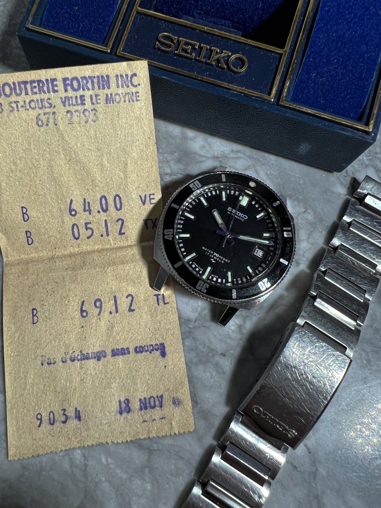 This watch is exceptionally special to Taro and his family, as the original owner was his wife Vickie’s late Father. Likely purchased as his first watch after being born in 1964, it then passed to Taro in 2013. Pictured below we can see the watch complete with its original bracelet, box and papers.